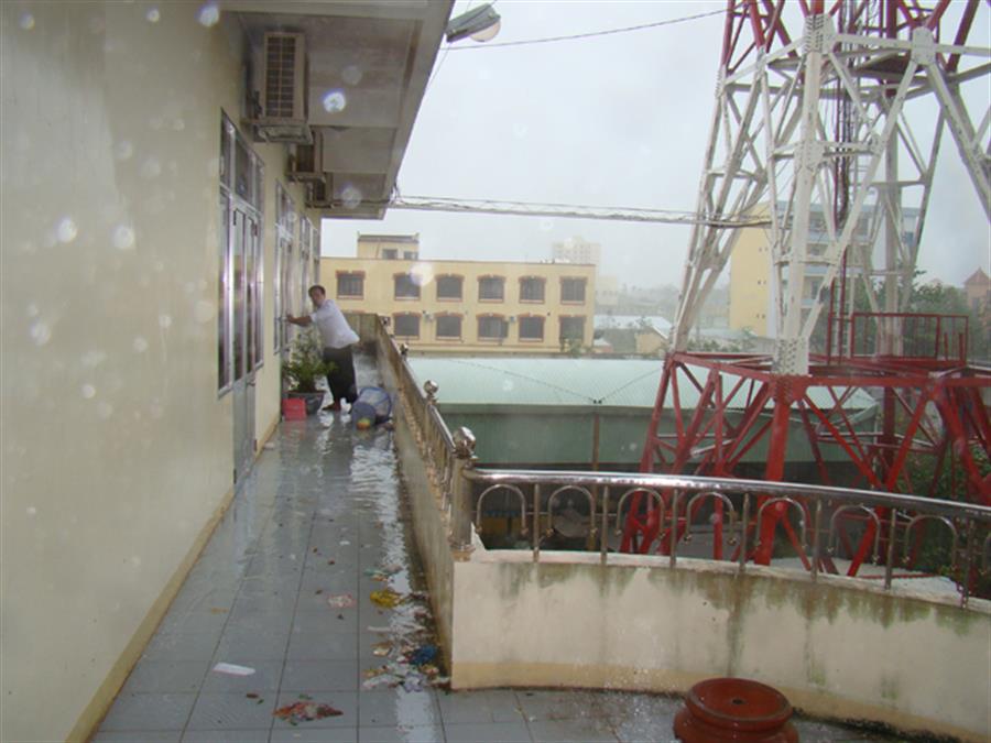 Tại trụ sở Trung tâm tất cả các cánh cửa lớn đều được gia cố bằng các cây gỗ và dây dù để tránh gió giật va đập mạnh làm bung cánh cửa và vỡ kính.