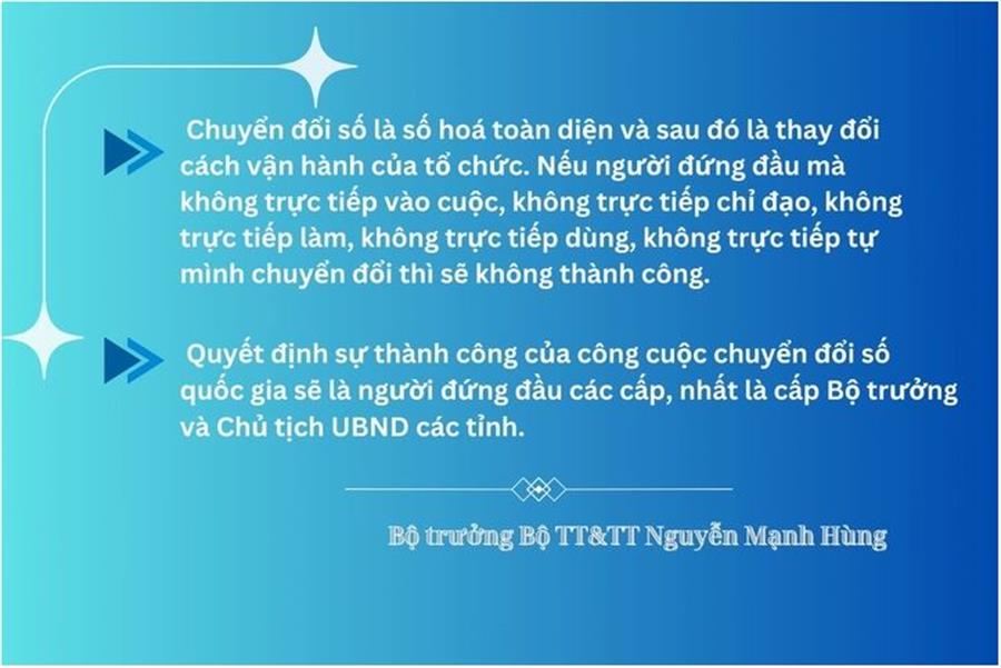 Ở Việt Nam chúng ta, qua 4 năm chuyển đổi số thì cơ bản các yếu tố công nghệ để thực hiện chuyển đổi số đã sẵn sàng, đã có một số thành công bước đầu rất đáng khích lệ, bây giờ quyết định sự thành công của công cuộc chuyển đổi số quốc gia sẽ là người đứng đầu các cấp, nhất là cấp Bộ trưởng và Chủ tịch UBND các tỉnh.