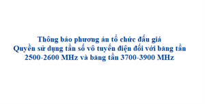 Công ty Đấu giá Hợp danh Số 5 - Quốc gia, đơn vị thực hiện cuộc đấu giá quyền sử dụng tần số vô tuyến điện (VTĐ) (Tổ chức đấu giá tài sản) vừa có các thông báo mời tham gia đấu giá quyền sử dụng tần số VTĐ với các khối băng tần B1 (2500-2600 MHz); C2 (3700 - 3800 MHz) và C3 (3800 - 3900 MHz).