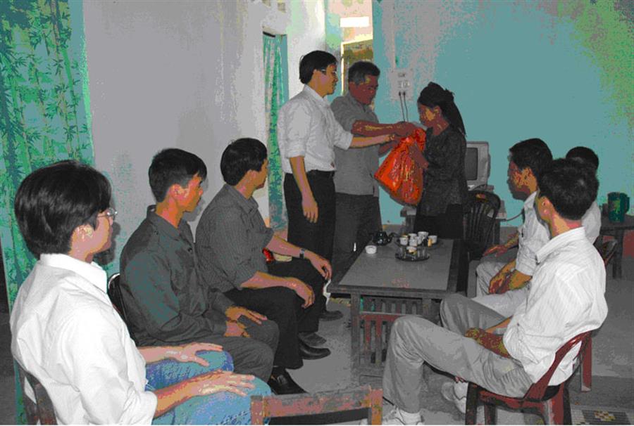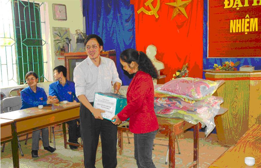 Tặng quà bà con xã Trương Lương. Đây là xã thuộc vùng 3. Theo phân loại là xã đặc biệt khó khăn, đang triển khai giai đoạn 2 thuộc Chương trình 135 của Chính phủ, xã chưa có điện, đất đai cằn cỗi. Xã có 565 hộ dân thì có 228 hộ nghèo. Do điều kiện đi lại, đoàn đã trao cho 12 hộ nghèo, đại diện của 12 xóm trong xã và gửi UBND xã phần quà cho các hộ nghèo khác.