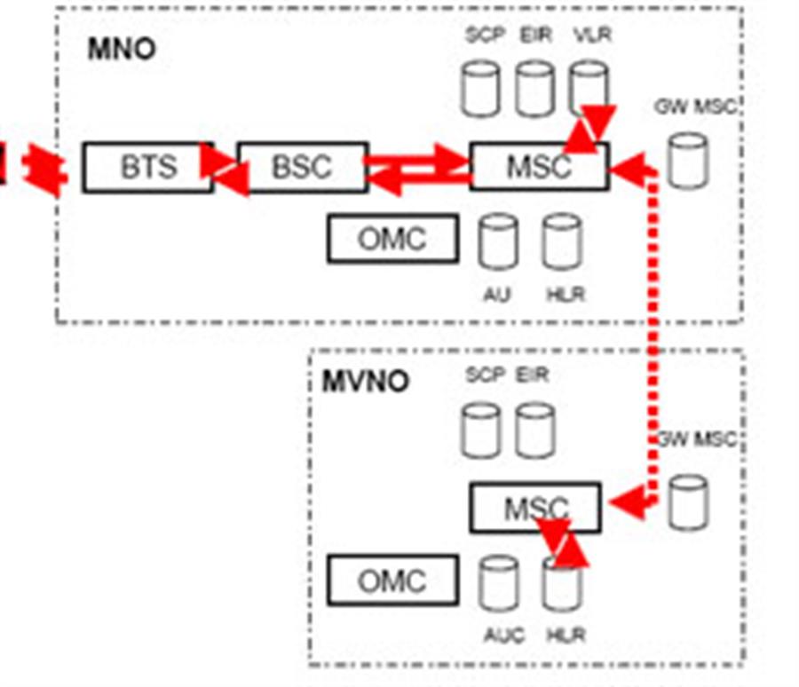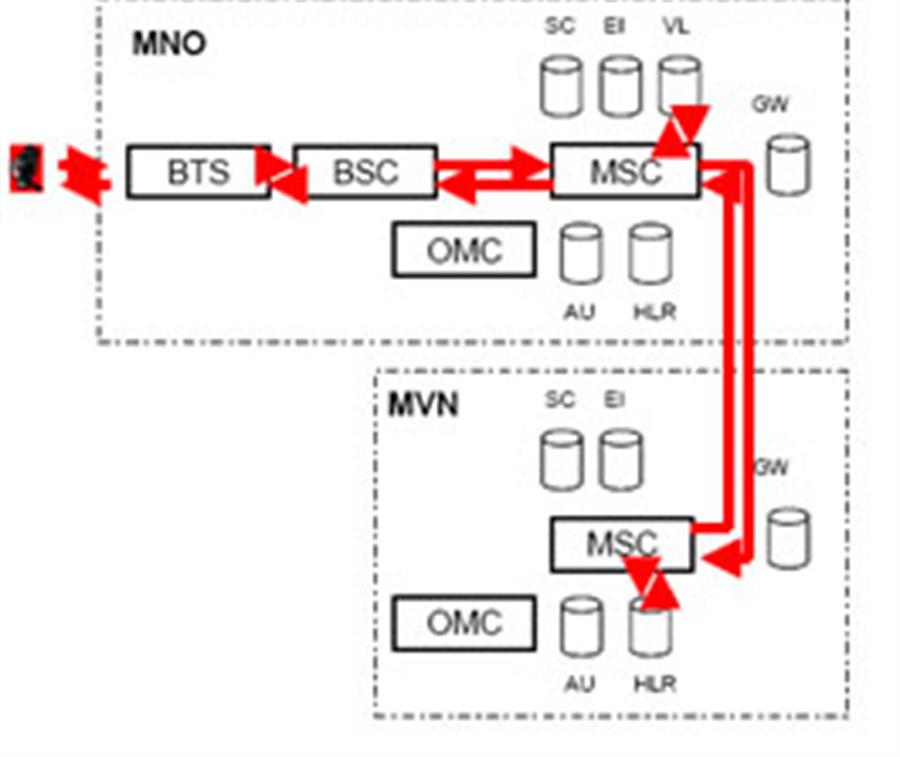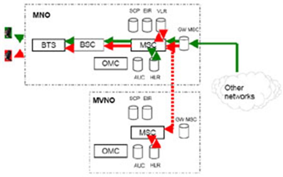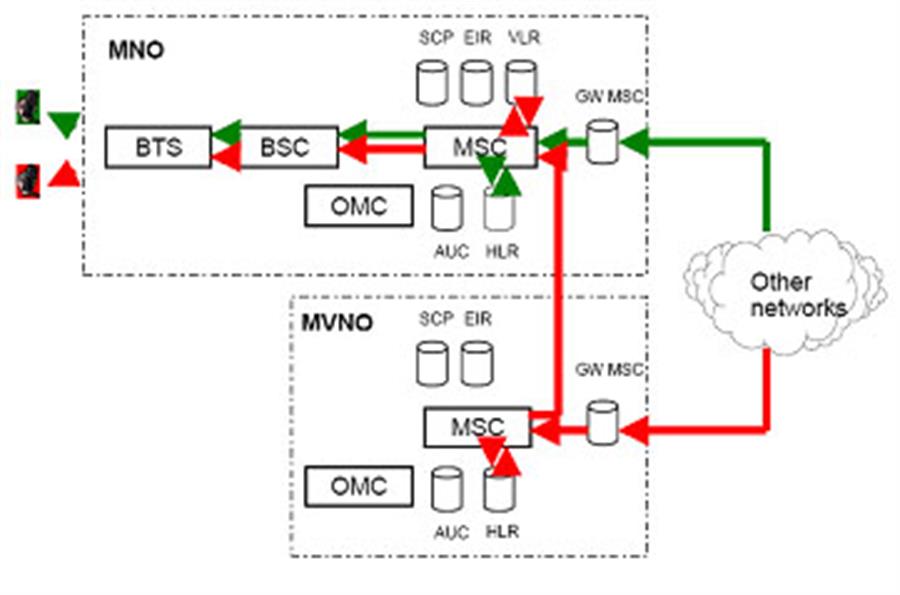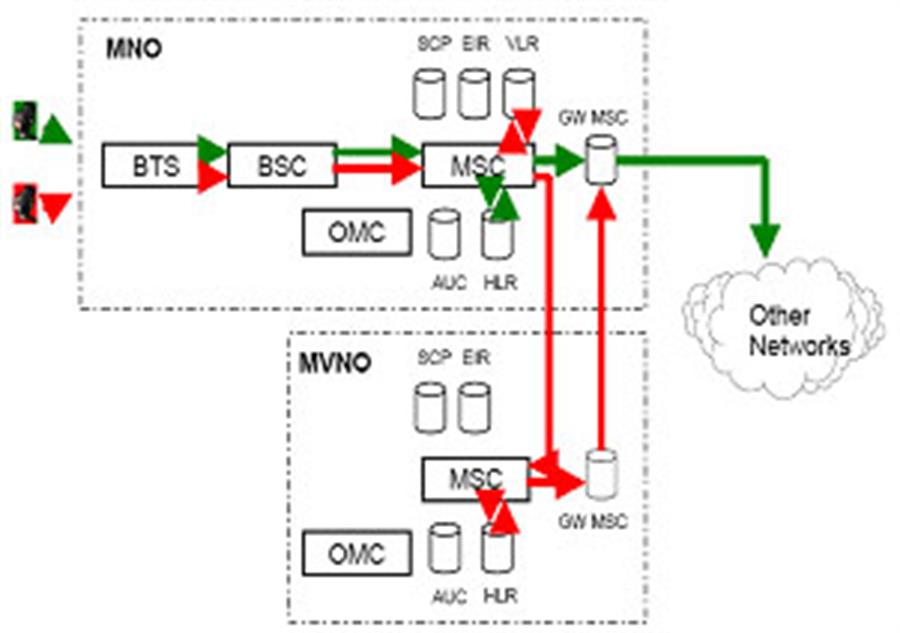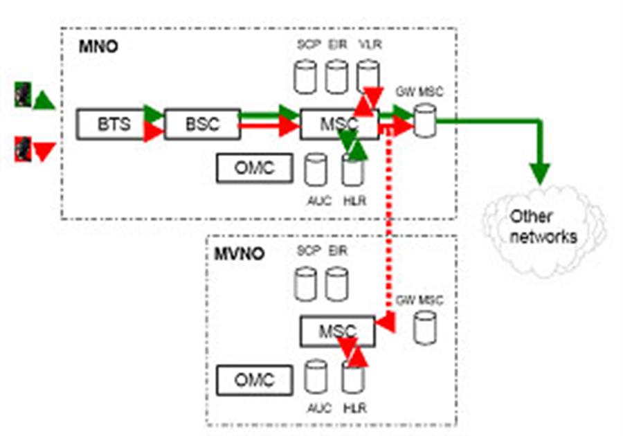 Trong trường hợp đầu tiên cuộc gọi từ thuê bao chủ được định tuyến qua BTS, BTS và MSC của MNO. Căn cứ vào thông tin trên VLR cuộc gọi sẽ được định tuyến tới MSC của MVNO và định tuyến ngược trở lại thuê bao bị gọi trên hạ tầng của MNO. Trong trường hợp thứ hai, cuộc gọi có thể được định tuyến ngay trên MSC của MNO, khi đó MVNO chỉ trao đổi các bản tin báo hiệu phục vụ cho công tác tính cước. Trường hợp này MVNO thực chất chỉ đóng vai trò nhà cung cấp dịch vụ và rất khó để triển khai các dịch vụ giá trị gia tăng.