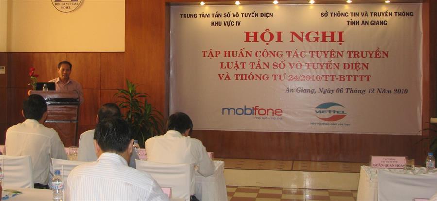 (rfd.gov.vn)- Ngày 06/12/2010, Trung tâm Tần số vô tuyến điện khu vực IV phối hợp với phòng Chính sách và Quy hoạch tần số vô tuyến điện, Sở Thông Tin và Truyền Thông tỉnh An Giang tổ chức thành công Hội nghị tập huấn công tác tuyên truyền Luật Tần số vô tuyến điện và Thông tư 24/2010/TT-BTTTT cho cán bộ, chuyên viên 10 Sở Thông tin và truyền thông trên địa bàn Tây Nam Bộ và các ban ngành, doanh nghiệp viễn thông, lực lượng vũ trang trên địa bàn tỉnh An Giang