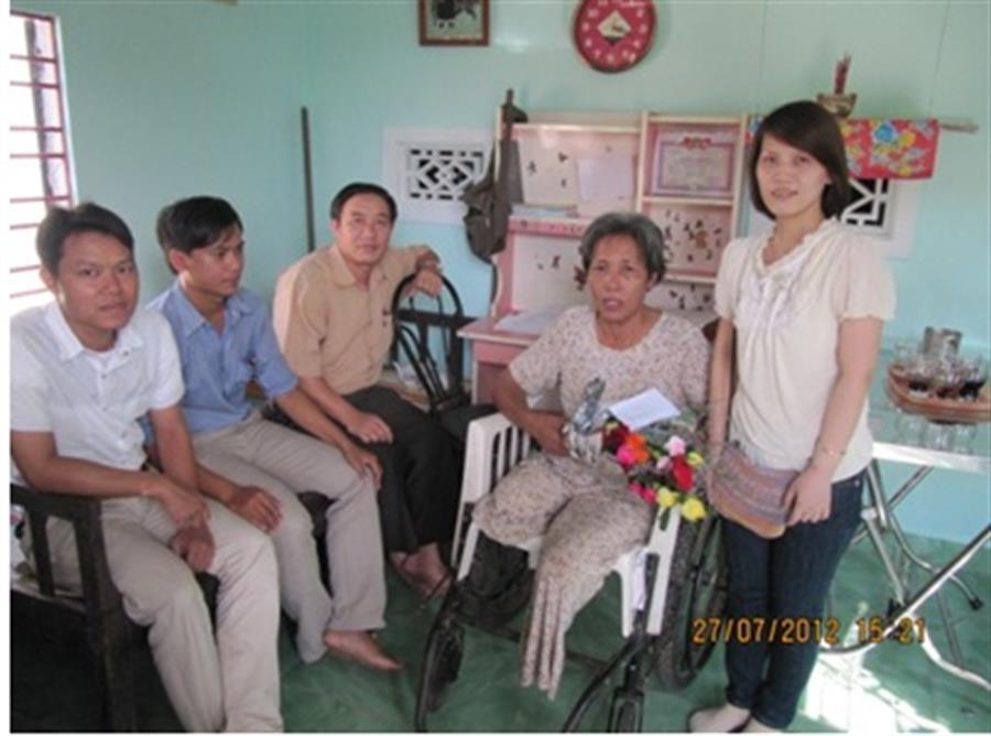 Thăm và tặng Sổ Tiết kiệm mệnh giá 1 triệu đồng cho cô Nguyễn Thị Ngôn- người thương binh ¼ sống tại nhà tình nghĩa của Ngành ở Điện Bàn, Quảng Nam. Vào những ngày đầu sau giải phóng, trở về cuộc sống đời thường với bao vất vả, khó khăn, đồng lương ít ỏi.. Cô vẫn ngày đêm tăng gia sản xuất, nhận hơn 1 sào ruộng lúa cấy, nuôi thêm gà vịt.. để chi phí trang trải cho gia đình.. Một gương sáng đầy nghị lực của người thương binh nặng của Ngành, tàn nhưng không phế. Trong cuộc nói chuyện với CBCC, Đoàn TN của Trung tâm, Cô vẫn cho mình là may mắn trở về thời bình, khi đồng đội Cô - 2/3 đã ở lại chiến trường. Giờ đây trong giấc ngủ của người thương binh vẫn chập chờn giấc mộng về những trận đòn roi, đánh đập dã tâm của kẻ thù..