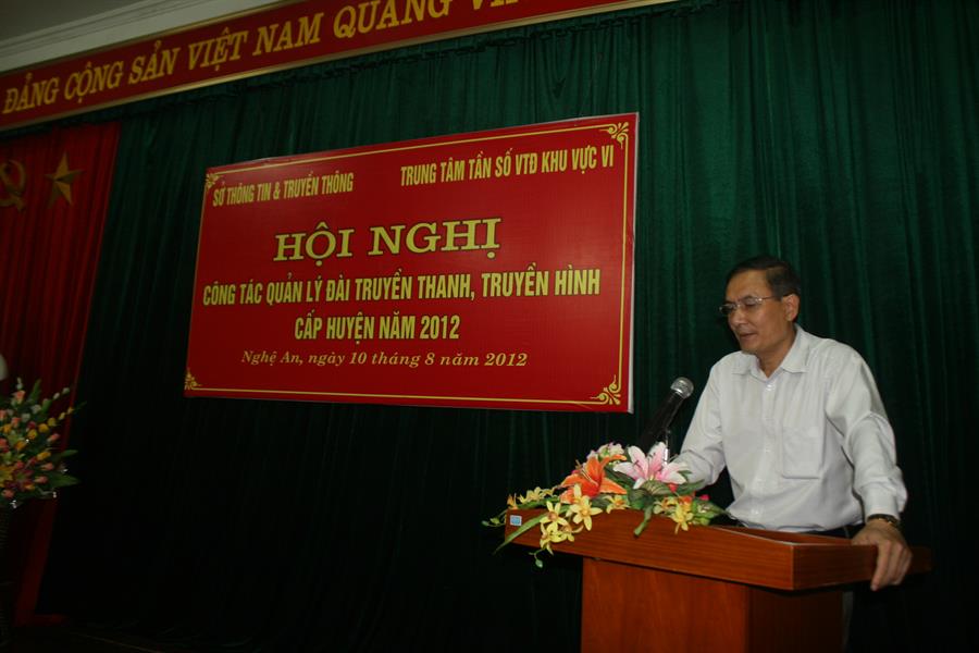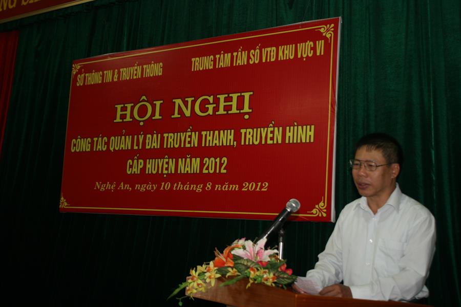 (rfd.gov.vn)- Thực hiện kế hoạch phối hợp công tác năm 2012, ngày 10/8/2012 tại thành phố Vinh – tỉnh Nghệ An, Trung tâm Tần số vô tuyến điện khu vực VI (Trung tâm) đã phối hợp với Sở Thông tin và Truyền thông Nghệ An (Sở) tổ chức thành công Hội nghị công tác quản lý Đài Truyền thanh - Truyền hình cấp huyện năm 2012 trên địa bàn tỉnh Nghệ An. Giám đốc Trung tâm Tần số vô tuyến điện khu vực VI ông Nguyễn Thế Cường, Giám đốc Sở Thông tin và Truyền thông Nghệ An ông Hồ Quang Thành và các Phó Giám đốc Sở Đặng Khắc Thắng, Phan Nguyên Hào đã đến dự và phát biểu tại hội nghị.