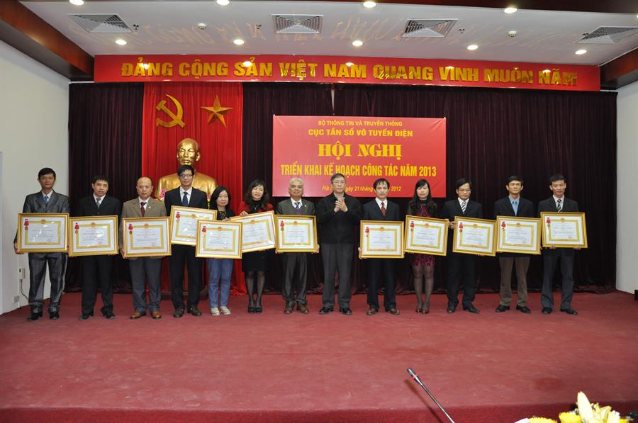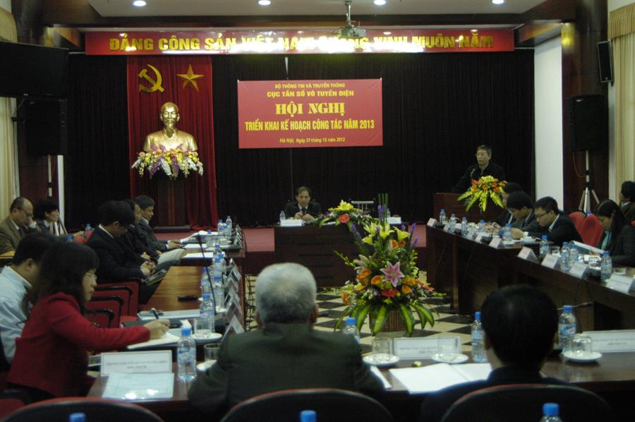 Đối với xây dựng văn bản pháp luật: tiếp tục giải trình tiếp thu các ý kiến để ban hành quyết định các băng tần, chuẩn bị cho đấu thầu băng tần trong năm tiếp theo; hoàn thành xây dựng trình Thủ tướng Chính phủ Quy hoạch phổ tần số VTĐ quốc gia, đảm bảo phù hợp với Luật Tần số VTĐ, kết quả Hội nghị WRC-2012 và xem xét tính đặc thù của Việt Nam; quy hoạch này phải là sở cứ tham chiếu thực sự hiệu quả khi xây dựng các quy hoạch cụ thể; trình Bộ phê duyệt quy hoạch tần số PTTH , để quy hoạch sớm đi vào vào cuộc sống; tập trung xử lý can nhiễu do hệ thống truyền thanh không dây gây ra; phối hợp với các cơ quan liên quan để giải quyết vấn đề phủ sóng indoor của Việt Nam; tiếp tục triển khai tốt công tác kiểm tra, cấp phép cho tàu cá; tiếp tục quan tâm phối hợp tần số biên giới với Lào, Campuchia, Trung Quốc; đẩy mạnh hoạt động trong Ủy ban tần số VTĐ Quốc gia; năm 2013 sẽ triển khai mạnh đề án số hóa truyền hình, trong đó Cục  phải triển khai các công việc quan trọng như hướng dẫn doanh nghiệp sản xuất, cung cấp dịch vụ, truyền thông, áp dụng tiêu chuẩn; quản lý hiệu quả các dự án đầu tư mà Cục đang và sẽ triển khai trong năm 2013.