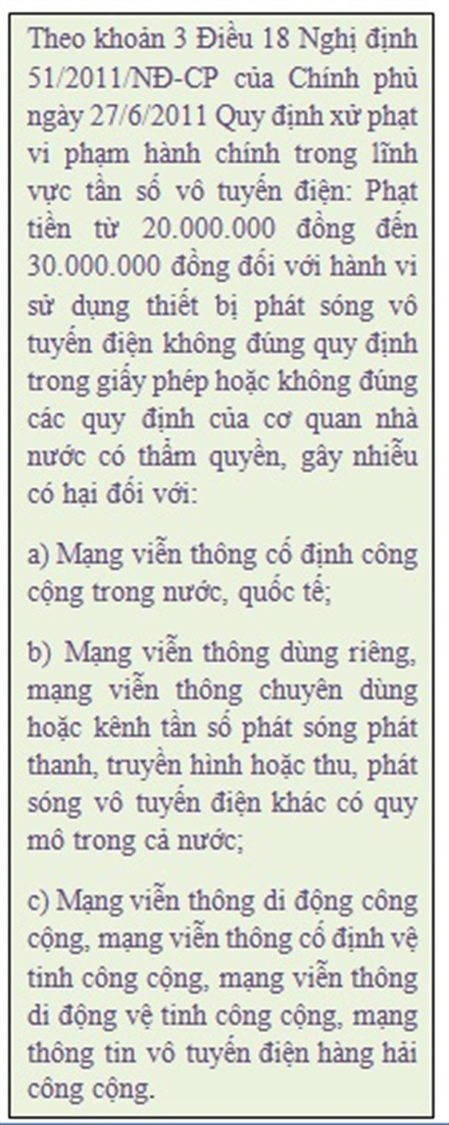 Theo khoản 3 Điều 18 Nghị định 51/2011/NĐ-CP của Chính phủ ngày 27/6/2011 Quy định xử phạt vi phạm hành chính trong lĩnh vực tần số vô tuyến điện: Phạt tiền từ 20.000.000 đồng đến 30.000.000 đồng đối với hành vi sử dụng thiết bị phát sóng vô tuyến điện không đúng quy định trong giấy phép hoặc không đúng các quy định của cơ quan nhà nước có thẩm quyền, gây nhiễu có hại đối với: