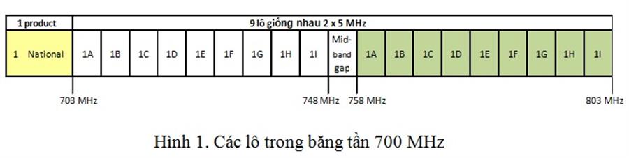 Đối với băng tần 700 MHz, có một gói thầu (product) gồm 09 lô giống nhau. Mỗi lô gồm 10 MHz song công (2x5MHz) với 5MHz ở băng tần cao và 5MHz ở băng tần tần thấp với khoảng cách giữa tần số thu và tần số phát là 55 MHz, trong đó, khoảng cách giữa băng tần thu và băng tần phát là băng tần trống 10 MHz (748–758 MHz). Đoạn băng tần trống này không đấu giá.