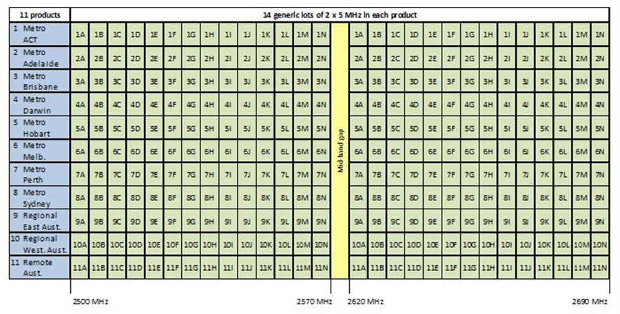 ACMA phân bổ các dải tần dưới đây để cấp phép băng tần bằng cách thức đấu giá: