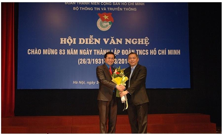 Thứ trưởng Trần Đức Lai đã trao tặng hoa cho Bí thư Đoàn Bộ Thông tin truyền thông chúc mừng Hội diễn văn nghệ thành công rực rỡ.