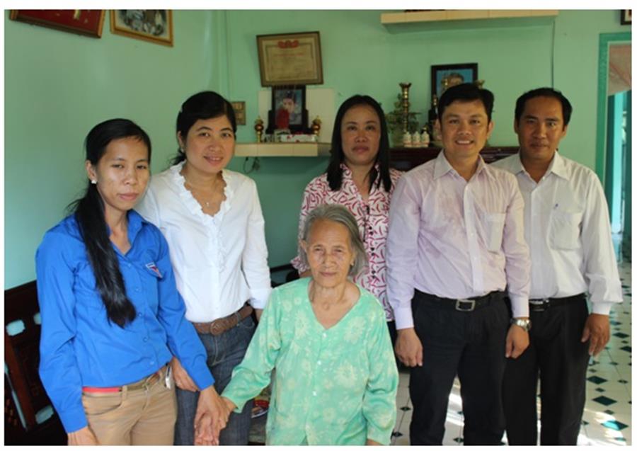 Tặng quà cho bà Huỳnh Thị Kế - 81 tuổi, mẹ Liệt sĩ Nguyễn Phú Đoàn, nguyên chiến sĩ tàu HQ 604, hy sinh ngày 14/3/1988 tại đảo Gạc Ma, thuộc cụm đảo Sinh Tồn, quần đảo Trường Sa, khi tuổi đời còn trẻ