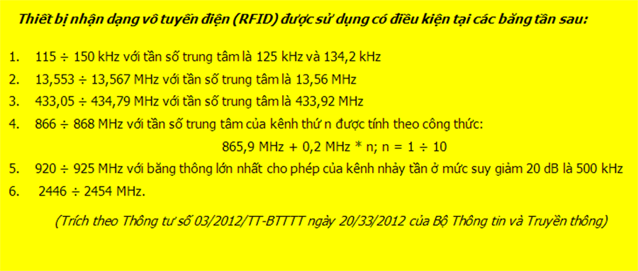 Nguyên nhân thứ hai được phát hiện là do một số đơn vị sử dụng thiết bị nhận dạng vô tuyến (RFID) không đúng quy định. RFID là loại thiết bị sử dụng sóng vô tuyến điện để tự động nhận dạng, phục vụ theo dõi, quản lý ra vào bãi đỗ xe, quản lý hàng hóa, container ở cảng, quản lý thư viện, kho hàng, siêu thị, nhân viên, nhận dạng động vật, Hệ thống thu phí giao thông, Thẻ thông minh, Hệ thống tính tiền ở siêu thị, quản lý hành khách ở sân bay…. Các thiết bị RFID gây nhiễu mà Trung tâm I phát hiện được là các thiết bị sử dụng dải tần số không đúng quy hoạch tần số của Việt Nam và các điều kiện kỹ thuật quy định tại Thông tư 03/2012/TT-BTTTT ngày 20/3/2012 của Bộ Thông tin và Truyền thông. Thực tế đo, kiểm tra cho thấy, các thiết bị trên đã gây nhiễu cho các trạm gốc thông tin di động.