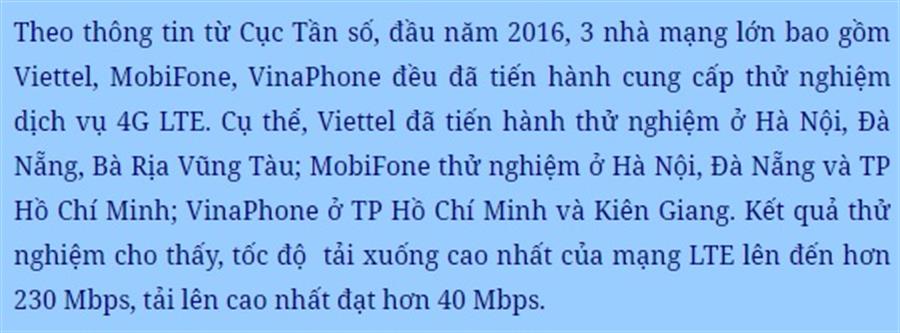 Ông Đoàn Quang Hoan, Cục trưởng Cục Tần số vô tuyến điện (Bộ TT&TT) cho biết, hiện tại đã là thời điểm chín muồi để phát triển dịch vụ 4G ở Việt Nam. “Ở Việt Nam, tỷ lệ người sử dụng 3G đã chiếm 30%, xu hướng tăng trưởng 2G đang giảm dần và đặt ra nhu cầu phát triển các dịch vụ kế tiếp. Các doanh nghiệp di động cũng đã đặt vấn đề cho phát triển mạng LTE ở Việt Nam”, ông Hoan nói.