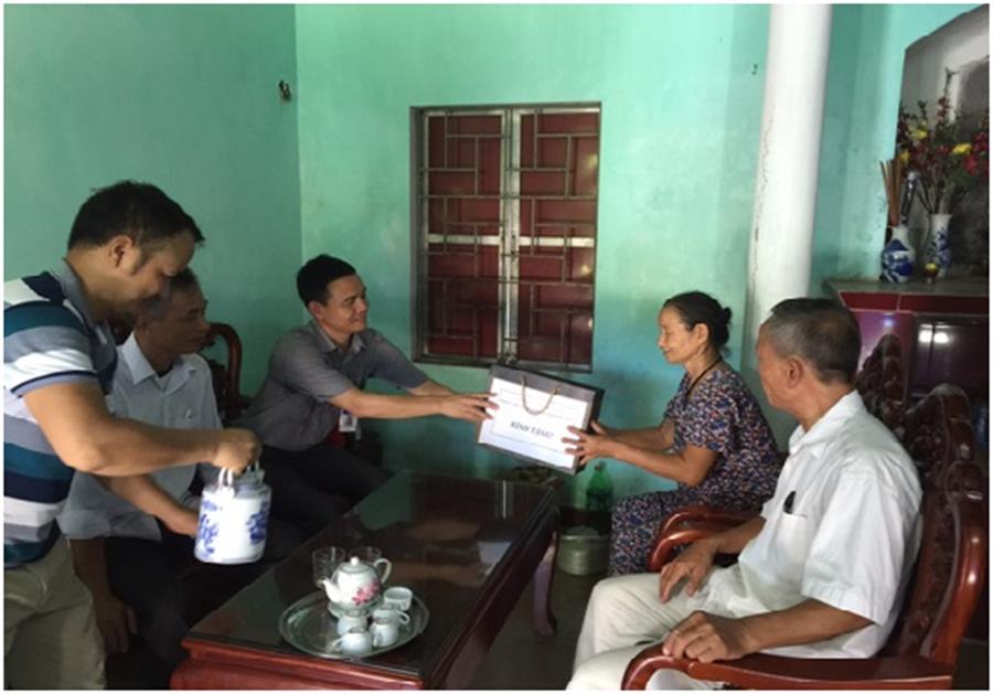 Thăm hỏi, tặng quà ông Nguyễn Tất Đích tại thôn Áng Thượng, xã Lê Thanh,  là lính đặc công bị thương ở đầu, chân và nhiễm chất độc hóa học, thương tật 81 %.