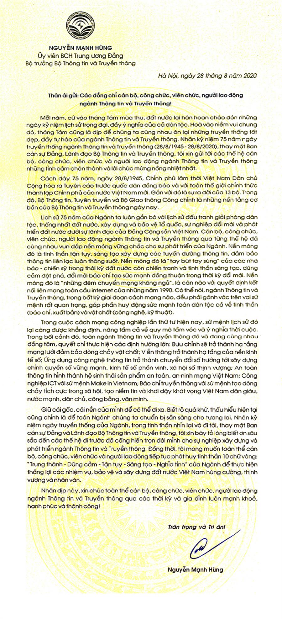 Mỗi năm, cứ vào tháng Tám mùa thu, đất nước lại hân hoan chào đón những ngày kỷ niệm lịch sử trọng đại, đầy ý nghĩa của cả dân tộc. Hoà vào niềm vui chung đó, tháng Tám cũng là dịp để chúng ta cùng nhau ôn lại những truyền thống tốt đẹp, đầy tự hào của ngành Thông tin và Truyền thông. Nhân kỷ niệm 75 năm ngày truyền thống ngành Thông tin và Truyền thông (28/8/1945 - 28/8/2020), thay mặt Ban cán sự Đảng, Lãnh đạo Bộ Thông tin và Truyền thông, tôi xin gửi tới các thế hệ cán bộ, công chức, viên chức và người lao động ngành Thông tin và Truyền thông những tình cảm chân thành và lời chúc mừng nồng nhiệt nhất.