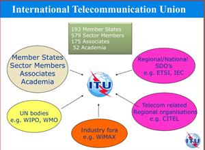 ITU-R của Liên minh Viễn thông quốc tế ITU chịu trách nhiệm thực thi các mục tiêu của ITU liên quan đến thông tin vô tuyến, cụ thể là việc bảo đảm sử dụng hợp lý, công bằng, có hiệu quả và tiết kiệm phổ tần số vô tuyến điện và quĩ đạo vệ tinh.