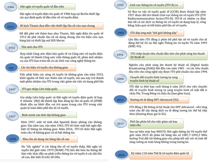 Tháng 12/2016, ITU tổ chức kỷ niệm 110 năm ngày thiết lập Thể lệ Vô tuyến điện quốc tế (the ITU Radio Regulations) - Hiệp ước quốc tế quan trọng về việc sử dụng phổ tần số vô tuyến điện và quỹ đạo vệ tinh cho thông tin vô tuyến. Việc thực thi Thể lệ Vô tuyến điện quốc tế đảm bảo các hệ thống thông tin vô tuyến hoạt động không gây can nhiễu lẫn nhau và cung cấp các phương thức để tất cả các nước có thể tiếp cận công bằng phổ vô tuyến, quỹ đạo vệ tinh - Một nguồn tài nguyên thiên nhiên khan hiếm, không phân biệt biên giới quốc gia và cần phải được hài hòa trên phạm vi toàn cầu.
