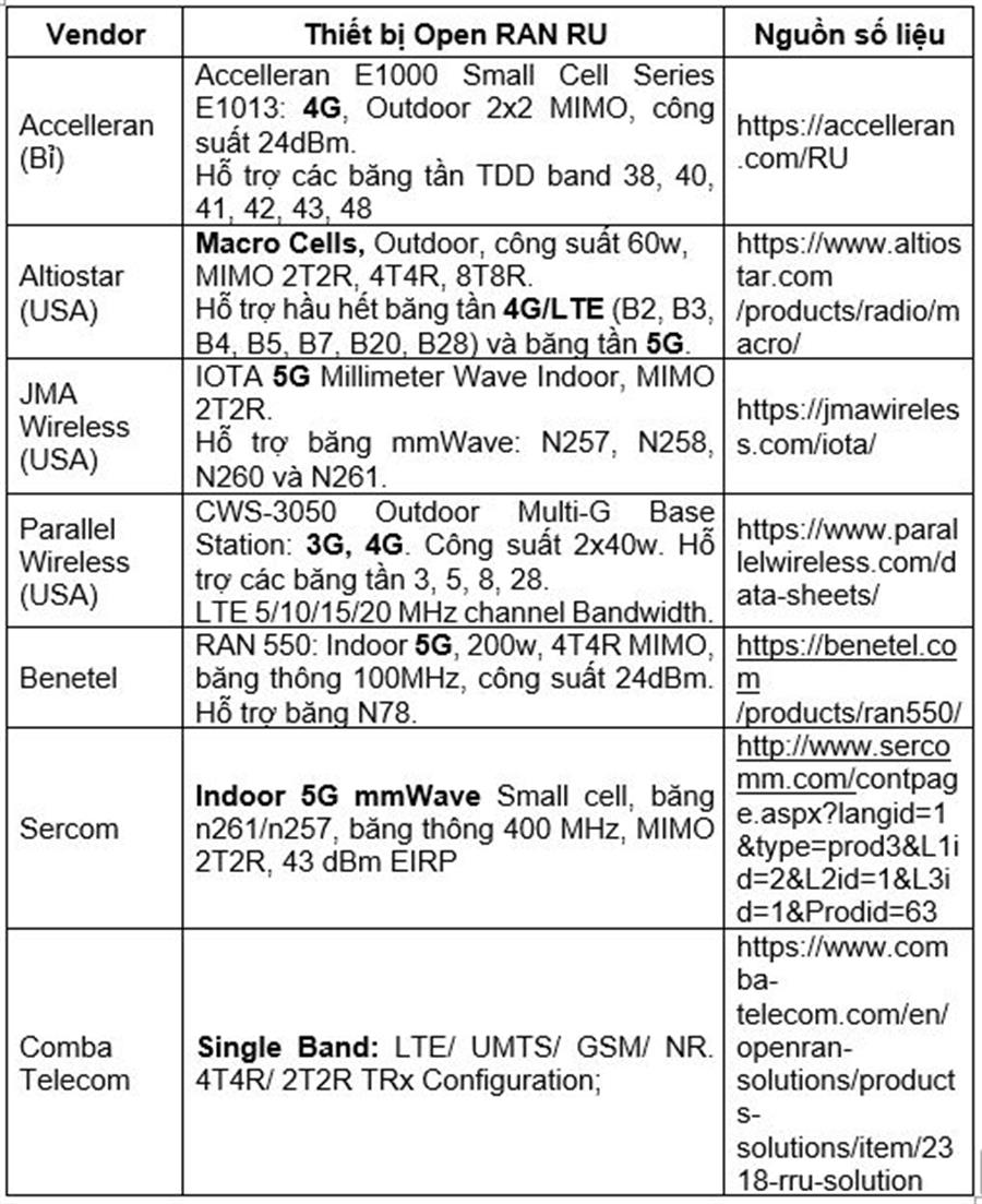 Bảng 1: Thiết bị Open RAN RU của một số Vendor