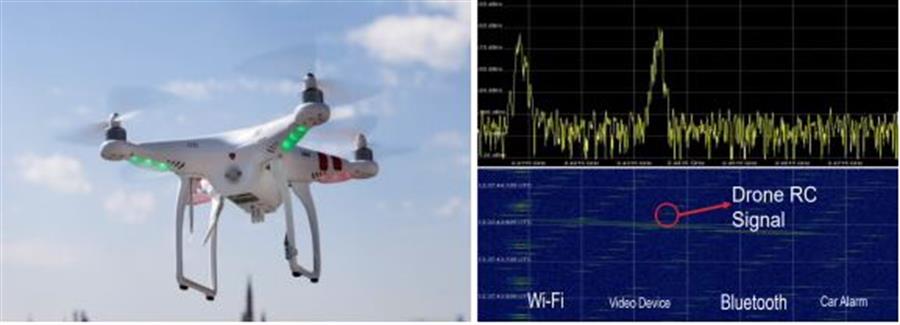 Do vậy, đối với thiết bị kiểm soát tần số truyền thống rất hạn chế trong việc phát hiện và nhận dạng được tín hiệu vô tuyến của drone thương mại bằng quan sát phổ tín hiệu, với 2 nguyên nhân: (1) Băng tần dung chung ISM 2.4 và 5.8 GHz có mật độ sử dụng cao và nhiều công nghệ vô tuyến cùng tồn tại, như WiFi, Bluetooth, điều khiển từ xa và cảnh báo từ xa; (2) FHSS thay đổi tần số sóng mang theo một chuỗi nhảy tần giả ngẫu nhiên trên dải tần rộng, có thể lên đến 80 MHz, trong khi đó DSSS trải phổ tín hiệu gần như nằm dưới nền nhiễu.