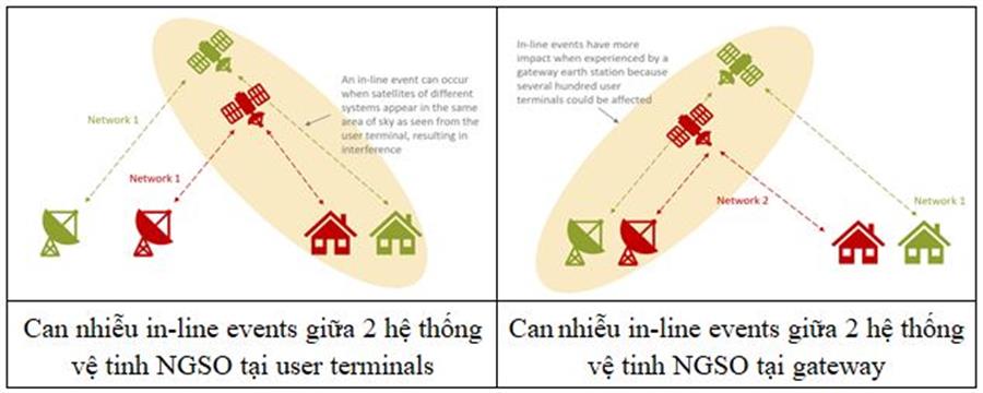 Can nhiễu khi các vệ tinh của các hệ thống NGSO khác nhau xuất hiện trong cùng vùng không gian từ hướng thu-phát của thiết bị người sử dụng (in-line events: khi chùm tia của hai hệ thống hướng quá gần nhau trong một một khoảng thời gian ngắn). Mặc dù, thời gian xảy ra in-line events rất ngắn, có thể vài giây nhưng có thể lặp lại và làm cho thiết bị người sử dụng mất nhiều thời gian hơn để kết nối lại với mạng. Mặt khác, in-line events sẽ có tác động can nhiễu nghiêm trọng hơn đối với đài gateway vì có thể dẫn tới hàng trăm thiết bị đầu cuối người sử dụng bị ảnh hưởng. In-line events thường xuyên xảy ra có thể làm gián đoạn hoặc làm suy giảm các dịch vụ được cung cấp cho người dùng.