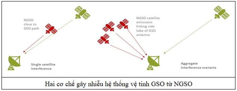 Can nhiễu giữa chùm vệ tinh NGSO băng rộng với các hệ thống vệ tinh GSO cũng có 2 cơ chế chính: Nhiễu từ một vệ tinh NGSO khi gần sát đường truyền dẫn của vệ tinh GSO đến đài trái đất (in-line events) và nhiễu cộng gộp (aggregate interference) từ nhiều vệ tinh NGSO phát xạ vào búp sóng phụ (side lobe) của ăng ten đài trái đất GSO.
