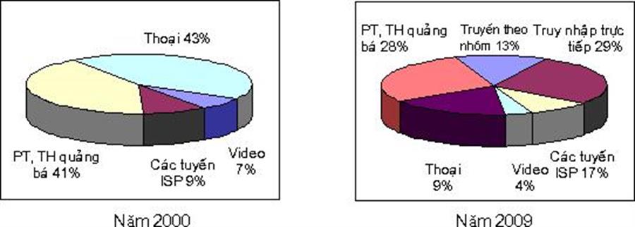 Hình 2. Tỷ lệ sử dụng băng thông vệ tinh trong khu vực châu Á năm 2000 và dự báo năm 2009