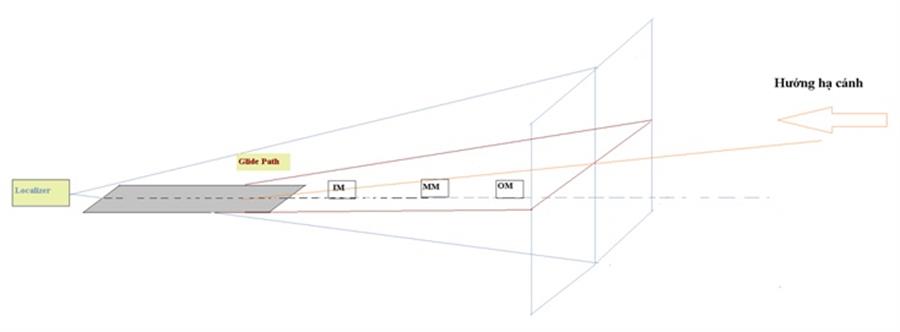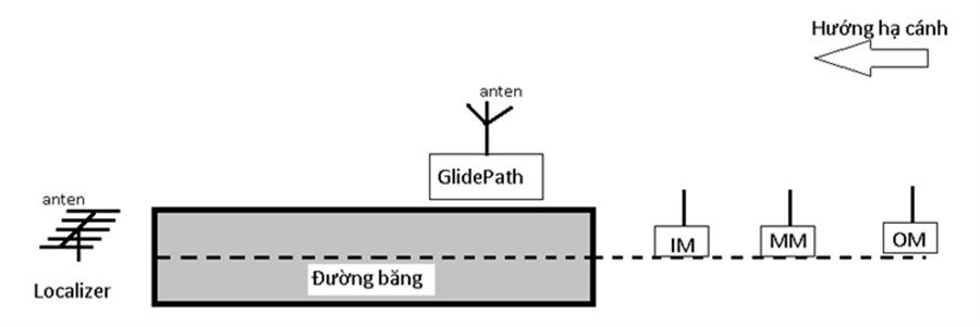 3. Các đài điểm chuẩn: Trong quá trình hạ cánh phi công cần xác định một số điểm có khoảng cách nhất định từ tàu bay đến điểm bắt đầu của đường băng (ví dụ: 1Km, 7Km…) Để cung cấp các thông tin này cho phi công người ta sử dụng các đài điểm chuẩn. Các đài này gồm đài điểm gần IM (Inner Marker), đài điểm giữa MM (Middle Marker), đài điểm xa OM (Outer Marker). Các đài vô tuyến điện này phát một tín hiệu theo búp sóng hình dải quạt hướng thẳng đứng. Khi tàu bay bay qua các đài điểm chuẩn sẽ thu được tín hiệu tương ứng qua đó xác định được khoảng cách hiện tại so với đường băng. Khoảng cách từ đài IM đến điểm bắt đầu đường băng là 300m, từ đài MM đến điểm bắt đầu đường băng là 1050m, từ đài OM đến điểm bắt đầu đường băng 8Km.