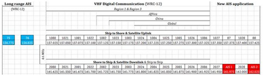 Theo Quy hoạch, chú thích số 5.287 dành ra 6 kênh tần số phân kênh 25 kHz trong băng tần 450 – 470 MHz (457.525; 457.550; 457.575; 467.525; 467.550 và 467.575 MHz) cho nhu cầu này, tuy nhiên khả năng sử dụng của 6 tần số này không đồng nhất ở mọi quốc gia trong khi khả năng di chuyển của tàu biển là gần như tại mọi vùng biển. Việc sử dụng đối khi bị hạn chế do các hệ thống trên bờ hoặc nghẽn kênh do nhiều tàu tập trung, bản thân băng tần 450 – 470 MHz cũng đã được xác định dành cho IMT